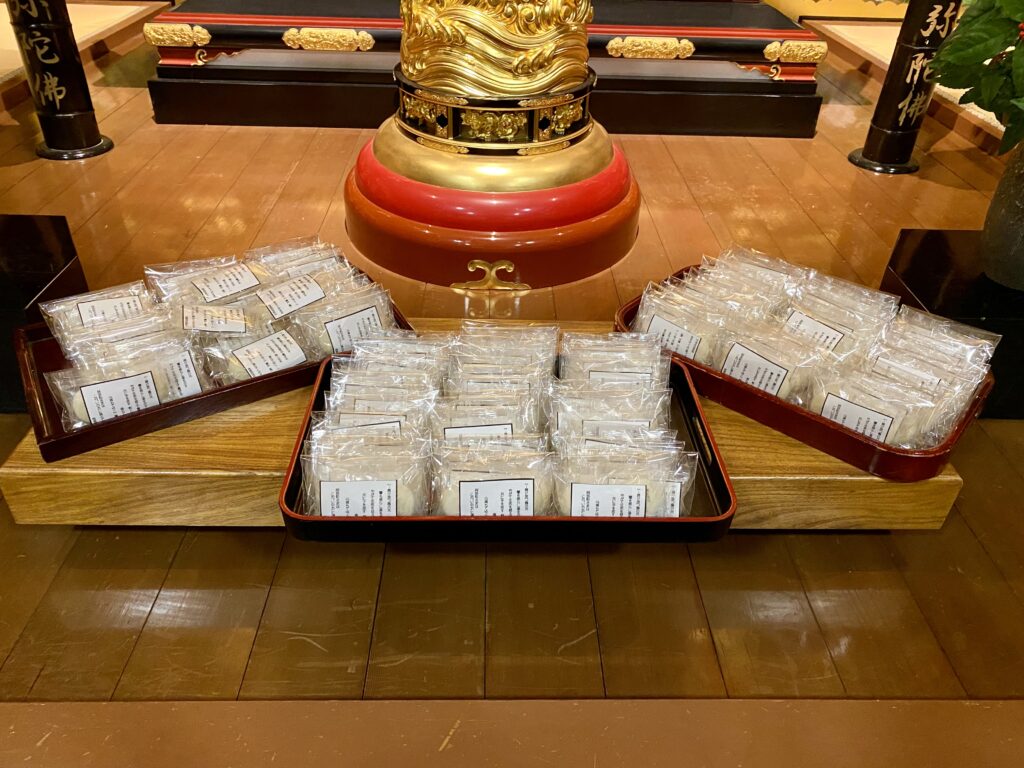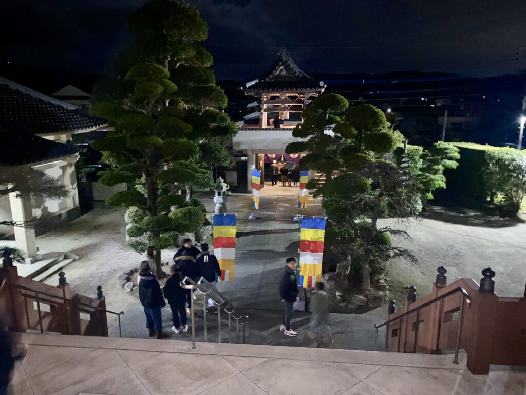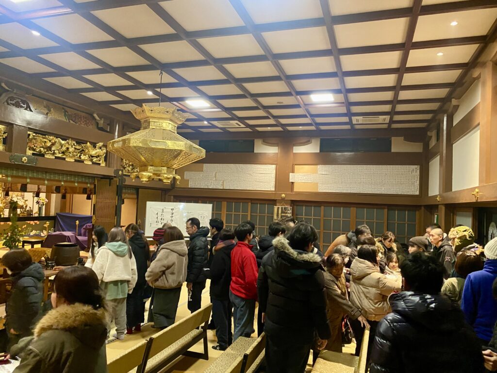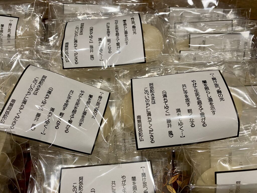 お念仏申す中に新年を迎え、お勤め・法話をし、参拝者の皆さまには、用意した108個のお餅(メッセージ入り)を配布しました。