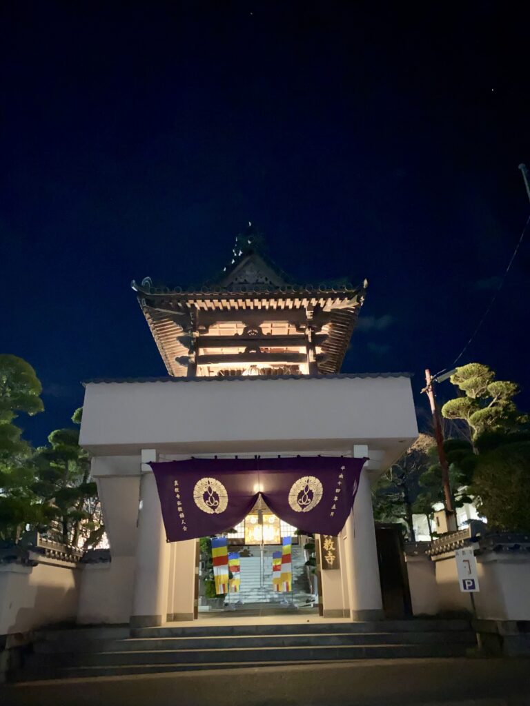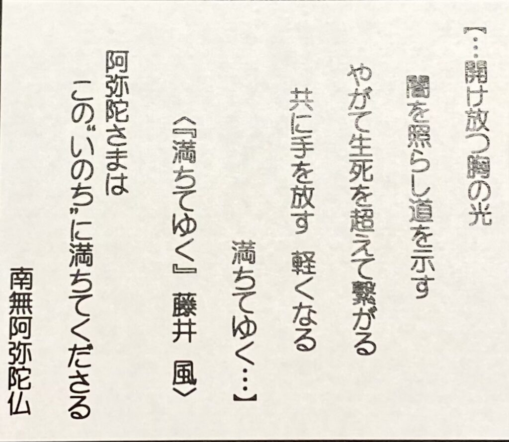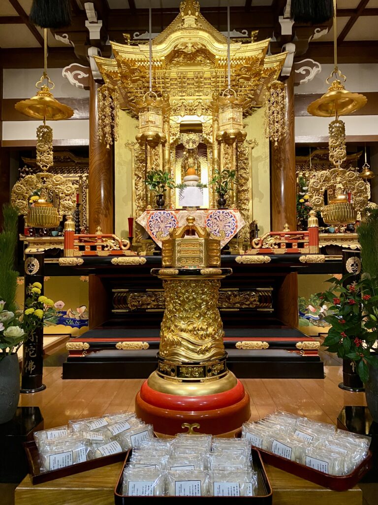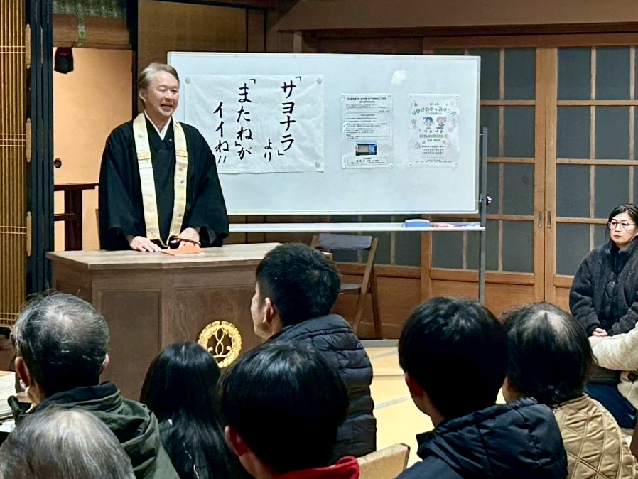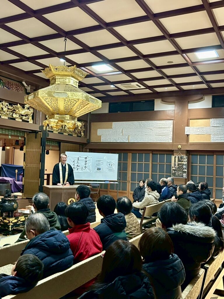 お念仏申す中に新年を迎え、お勤め・法話をし、参拝者の皆さまには、用意した108個のお餅(メッセージ入り)を配布しました。